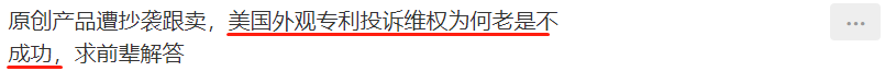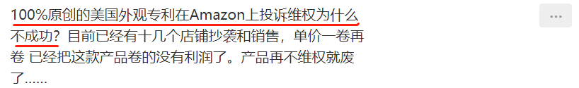 而事实似乎的确如此,越来越多卖家反馈投诉专利侵权难成功。100%原创的美国外观专利在亚马逊上投诉维权多次都没有成功,被十几家店铺抄袭销售也无能为力,只能眼睁睁看着产品被卷废。