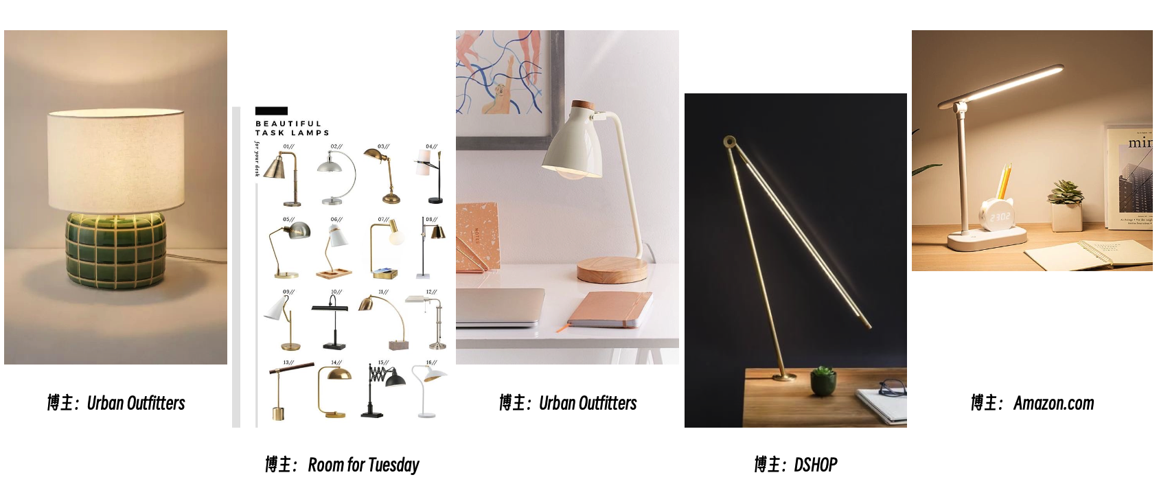 desk lamp关键词搜索结果下,热门Pin图大多是简洁的风格,色调以黑/白/米色为主;品牌Urban Outfitters和DSHOP的素材可以关注一下。Urban Outfitters是时尚生活方式品牌,线上售卖产品不止灯具,品牌其他产品素材图也可作为灯具商品的背景素材参考。