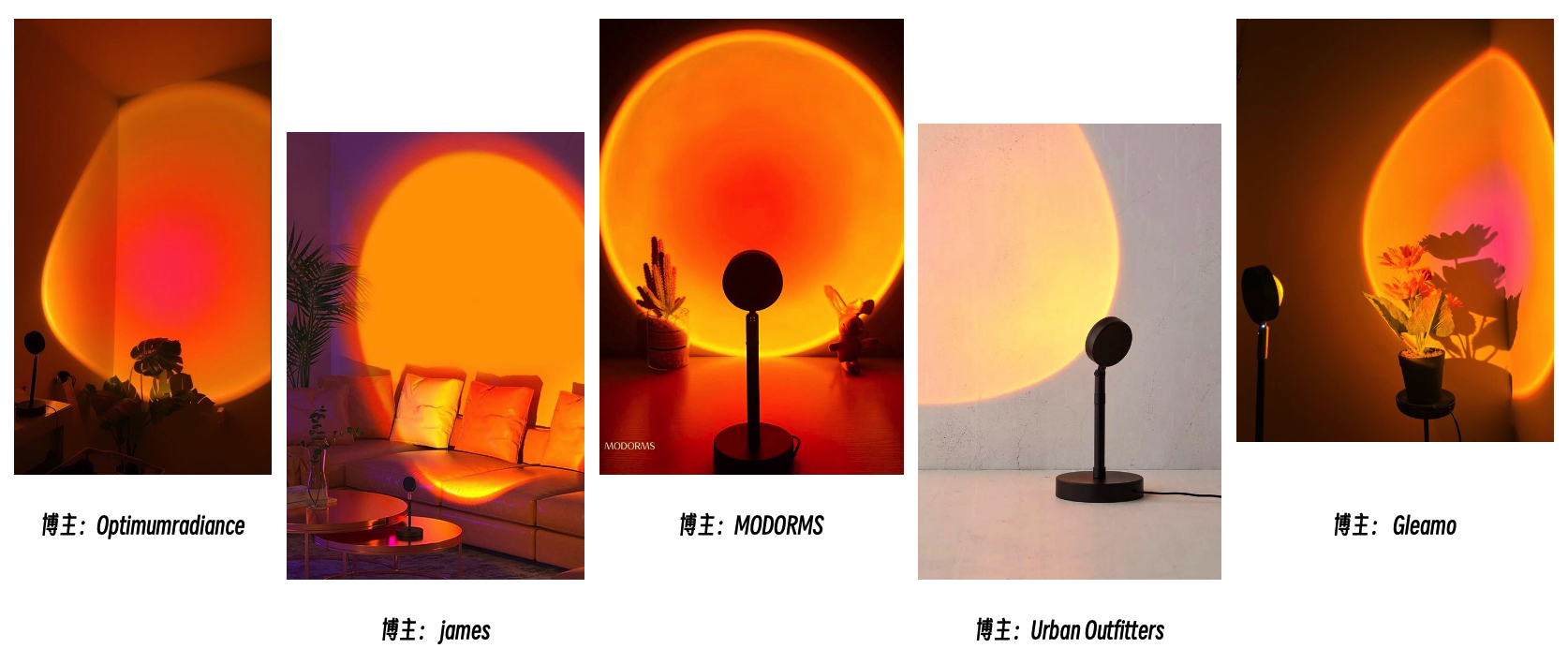 sunset lamp本身就明确地指向落日灯这款商品,从热门Pin图来看,不同品牌推出的商品外观和灯照效果几乎没有差异,基本都是圆形的橘色灯光映照在墙壁上,露出家中一角的沙发或绿植。在如此趋同的产品中,Urban Outfitters使用的浅淡橘黄和干净白底背景反而显得别出一格。产品趋同,用不同风格的素材打造差异化也是一个跨境电商灯具营销有效吸引注意力的方法。