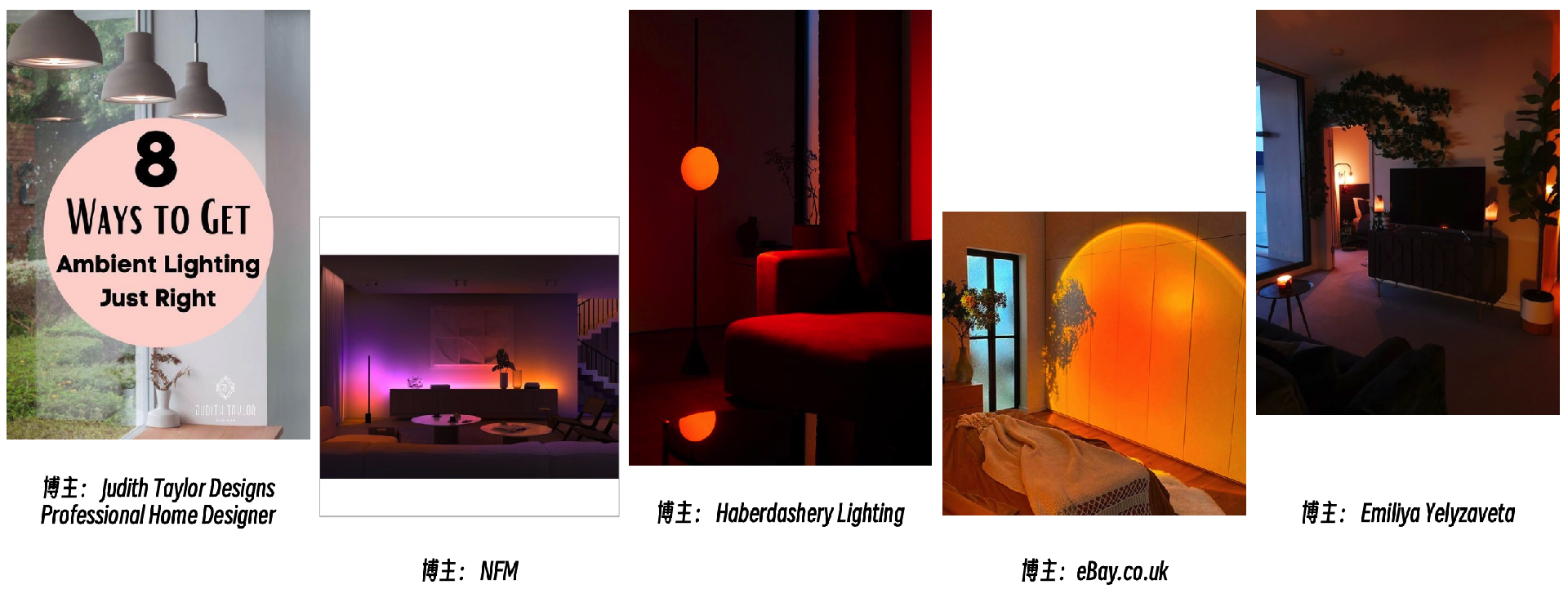 可以看出,ambient lighting相关的热门Pin图的重点在“环境”而非“照明”,画面中除了灯具,更多的是家具,比如沙发、电视柜、绿植等等,暗色调的家具衬托高饱和色调的灯具,给人留下品味很好的第一印象。