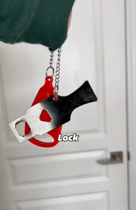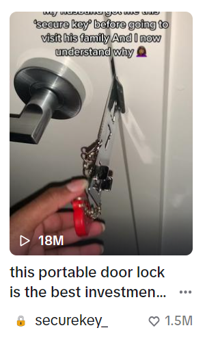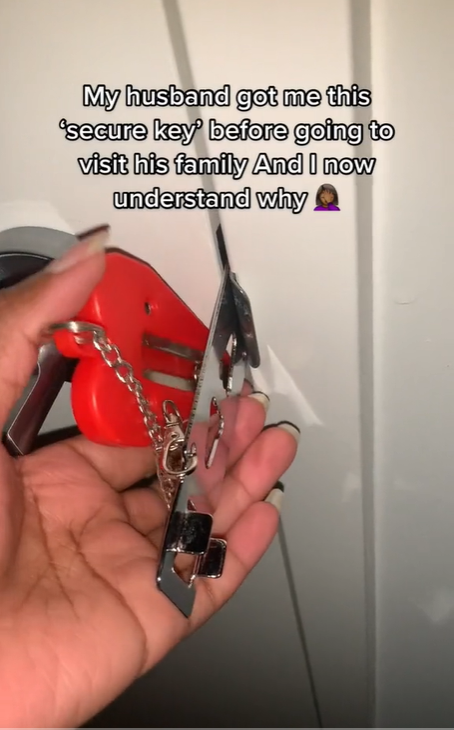视频一开始旁白配音,“我丈夫带我去他家时,给我这把安全锁,现在我知道为什么了。”