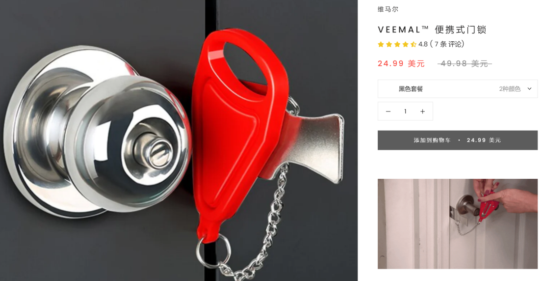这个产品很普通,就是可以随身携带的便携式门锁。 在外出居住环境下,在房间内门锁上加上一道只有室内才能打开的附加门锁。