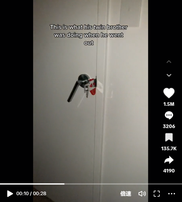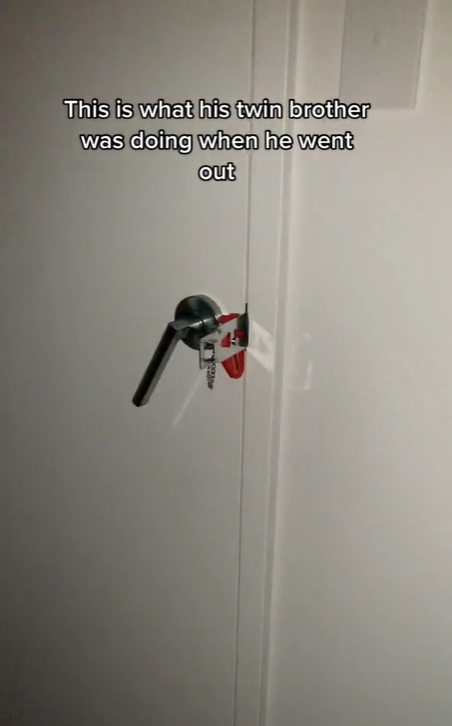 在安上安全锁后,突然门把被剧烈地转动,门外似乎有人急迫地想闯入。 视频旁白配音解说到,“我丈夫外出后,这就是他的双胞胎兄弟干的事情。 ”