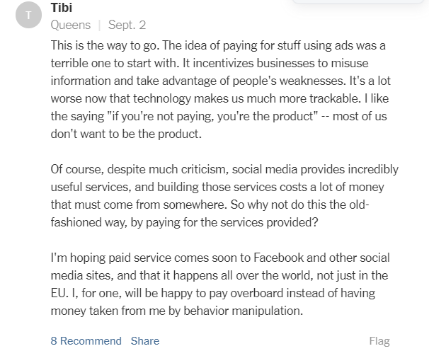 对于这一行为,部分用户也持支持态度,有消费者认为:“我希望Facebook和其他社交媒体网站很快就能提供付费服务,并在全世界范围内实现,而不仅仅是在欧盟。就我个人而言,我很乐意付出过多的钱,而不是被行为操纵从我身上拿走钱。”