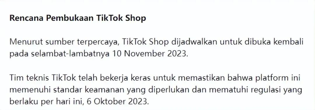 最让人印象深刻的就是10月中旬据某“权威消息人士”透露,“TikTok Shop印尼站点最迟将于今年11月10日恢复营业。TikTok的技术团队努力确保该平台满足必要的安全标准并遵守10月6日的法规。”