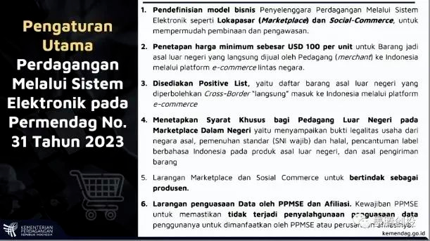 此前,德登就曾表示,印尼官方对TikTok Shop的回归表示欢迎。不过,德登也强调:TikTok要进行商品销售和交易,必须在印尼成立新公司并获得相应的许可证,同时需遵守新的电商法规,即印尼《2023年第31号贸易部长令》对通过电子系统的贸易进行的主要规定。