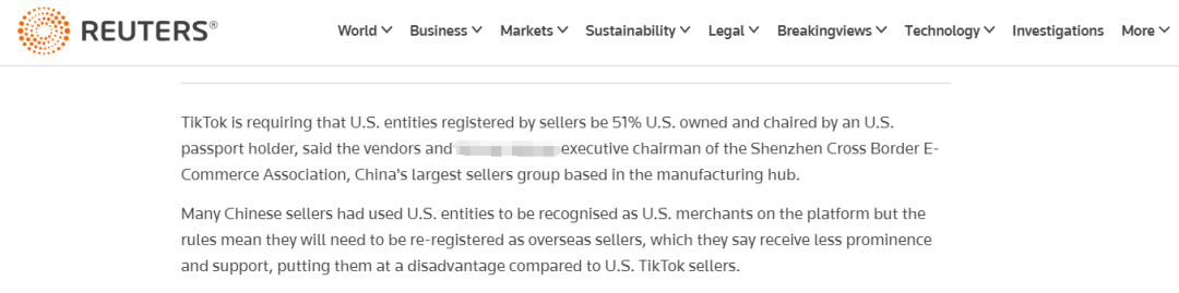 路透社消息,“TikTok要求在美国注册的卖家实体必须由美国人控股51%,并由持有美国护照的人担任主席。”