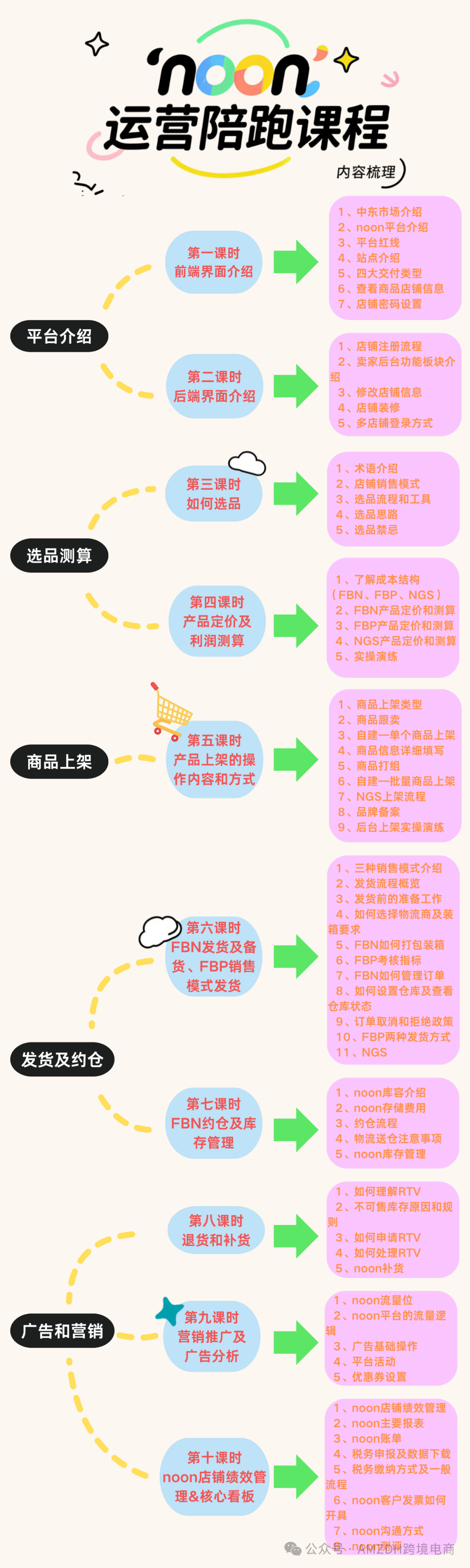 前期建议选择Noon官方仓(FBN),后期可拓展跨境专线(时效7-15天)。 营销节点