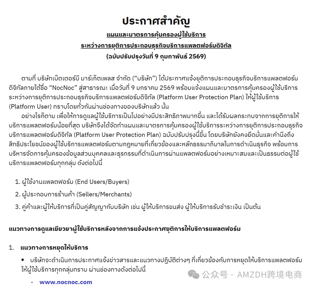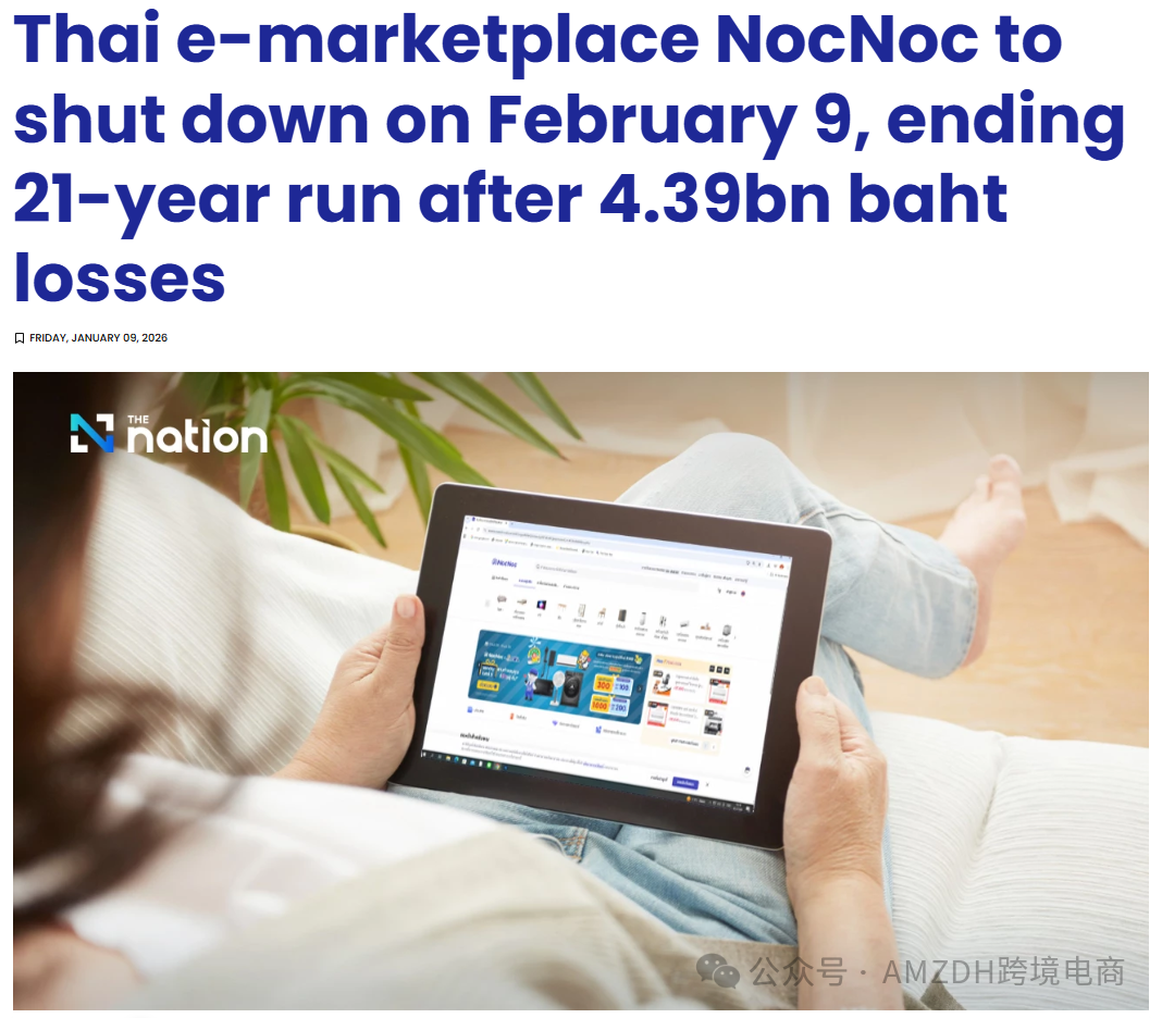 AMZDH获悉,2月9日,泰国本土家居电商平台NocNoc宣布将于2月9日起停止接单,并计划于5月9日全面关停。这一消息震惊了东南亚电商行业,因为NocNoc已有21年的运营历史,是泰国本土家居建材电商领域的重要参与者。