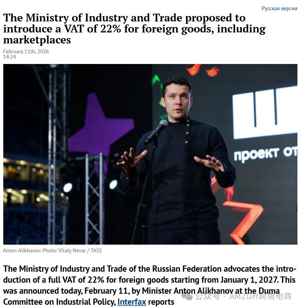 AMZDH获悉,近日,俄罗斯工贸部提出一项重大税收改革方案:自2027年1月1日起,对进口商品征收全额22%的增值税。这一激进提议与俄罗斯财政部此前公布的渐进增税计划形成鲜明对比,凸显俄政府在保护本土零售业与维持跨境贸易活力之间的政策博弈。