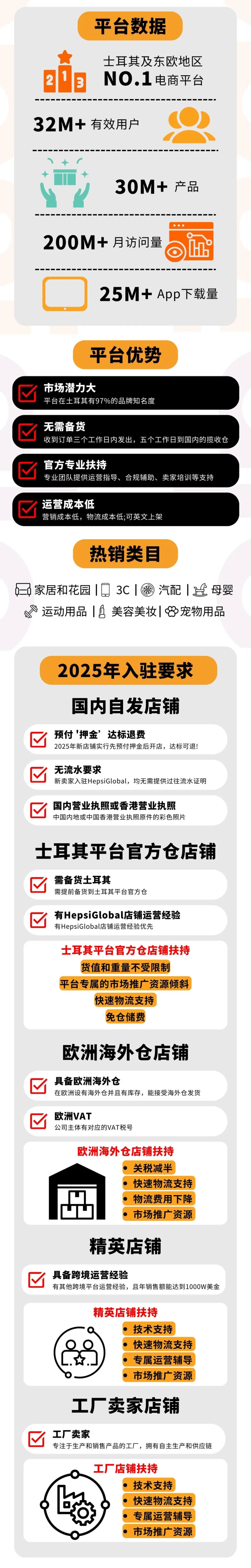 营业执照(中国大陆/港澳台地区均可),需要企业营业执照,个体户不行 法人身份证正反面扫描件 邮箱、手机号、店铺名称(需唯一) Payoneer账户信息(用于收款) 店铺类型(详见文末附图): ① 国内自发货店铺(出单后3个工作日内发货,5个工作日内到达国内揽收仓) ② 平台官方仓店铺(需备货土耳其官方仓,且有贺佰狮平台运营经验),免仓储费 ③ 欧洲海外仓店铺(需备货欧洲海外仓,且有对应的VAT税号) ④ 精英店铺(需年销售额1000w美金以上才可申请) ⑤ 工厂卖家店铺(拥有自主生成和供应链) 详见下方Hepsiburada入驻指南 或详询AMZDH客服 https://doc.weixin.qq.com/doc/w3_AJ4AIQaWANICNQKyx3u8iSyeIk5Mr?scode=AIgAIgfRAAw1tlfyQ0AJ4AIQaWANI