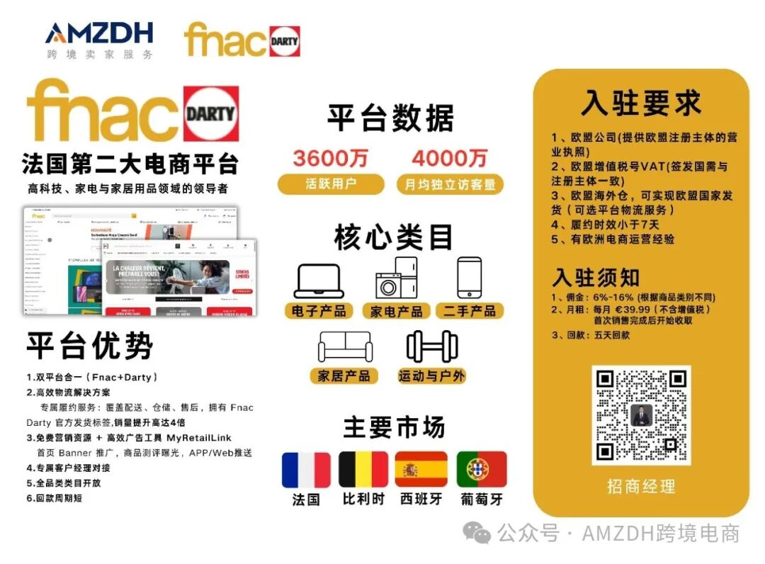作为法国领先的电商平台,高科技、家电与家居用品领域的领导者,FNAC(Fnac Darty)凭借3600万的活跃用户,每月超4000万独立访客的流量,成为欧洲增长最快的平台之一。今天AMZDH将深度解析FNAC的核心优势、费用结构及入驻要求,助力卖家抢占法国及欧洲市场!找AMZDH入驻还享下店后1对1的运营支持服务哦