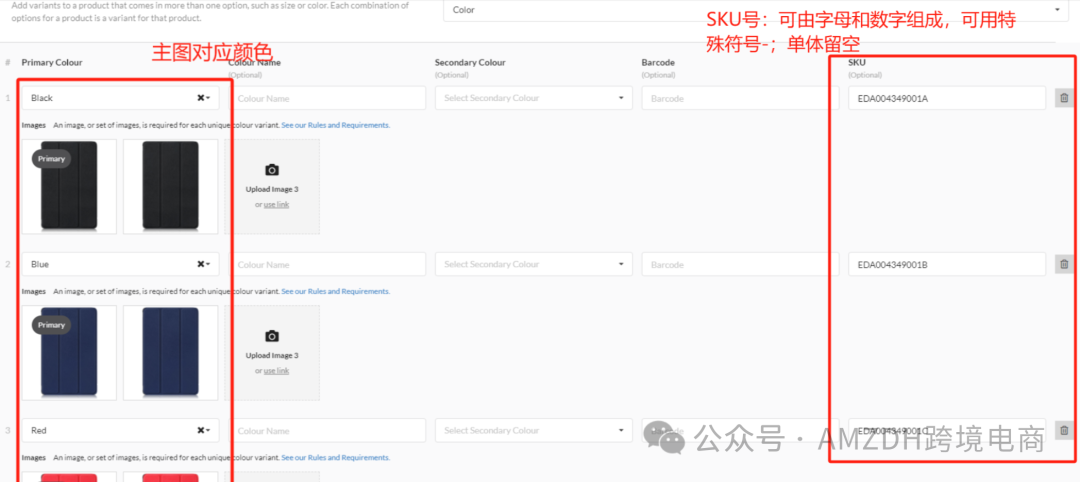 1.标红的为必填属性,产品图片颜色等常见属性必填;其他选填项可以根据产品属性来添加,信息越全面越能吸引消费者。