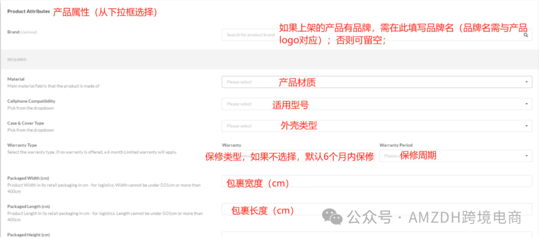 2.需要填写必需的属性:Main Category,Lowest Category,Product Title,Key Selling Features, What's in the Box需要填写(1x产品英文名字)