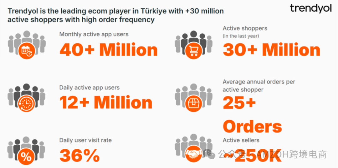 Trendyol平台覆盖土耳其、德国、中东(阿联酋、沙特、卡塔尔等)及北非地区,2021年GMV达100亿美元,日均包裹量超100万件。截止2024年,平台估值达165亿美元,平台并通过自建物流网络拓展至德国、沙特、阿联酋等市场,月活跃用户超过 4000 万,日活跃App用户达 1200 多万,平均每位活跃用户每年下单25次以上。