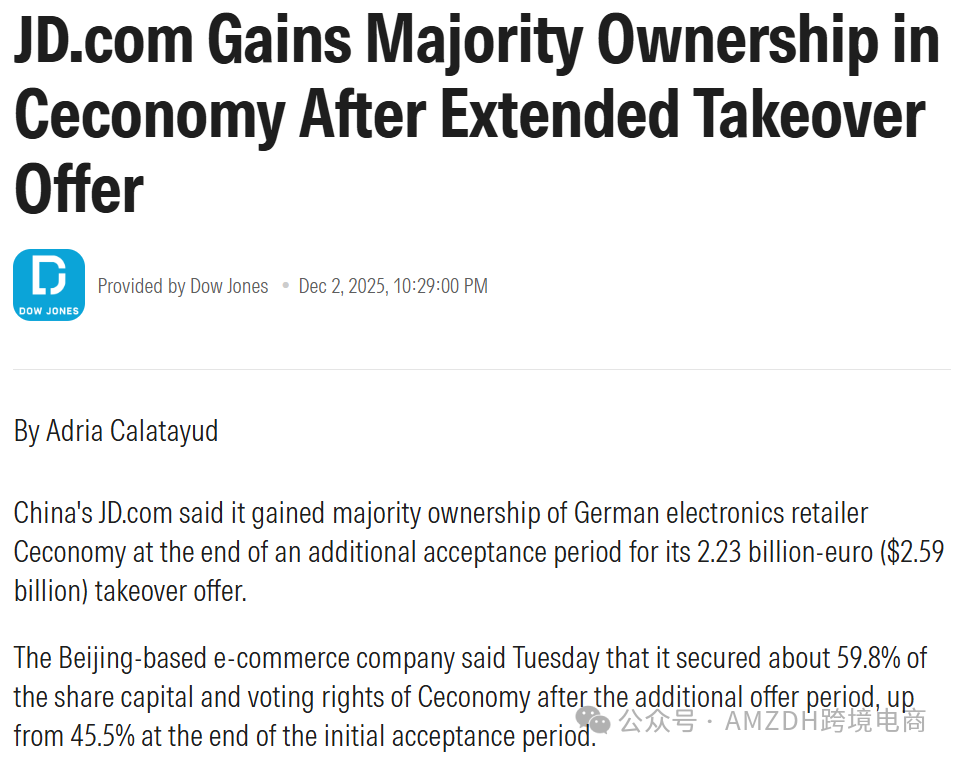 这笔估值22亿欧元(约合人民币185亿元)的交易,始于今年7月京东在港交所的公告,当时京东以每股4.60欧元的现金对价发起全面收购要约。如今股权交割取得关键进展,京东明确表示待要约完成后或推进Ceconomy退市,这场中国电商出海欧洲的最大规模收购,正进入收官倒计时,预计2026年上半年将正式落定。