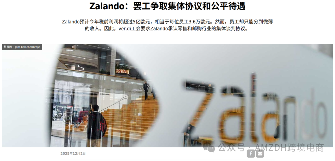 12 月 1 日,德国工会 Verdi 针对 Zalando 发起 “警告性罢工”,恰逢圣诞购物旺季,直接冲击平台物流履约能力。这场罢工的核心矛盾,聚焦在 “薪酬不公” 上: