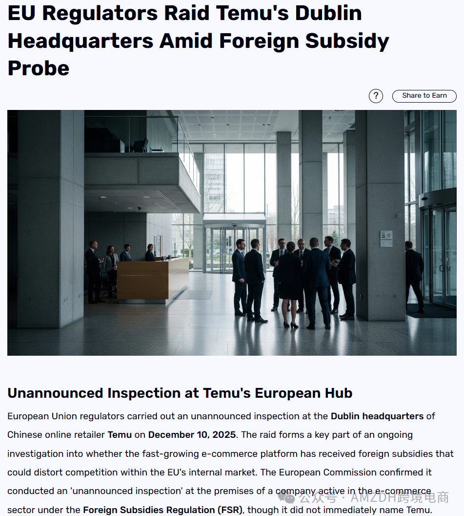 此次欧盟的突击检查,标志着 Temu 在欧洲市场的合规风险进入上升通道。未来,欧盟监管调查的后续进展、2026 年免税政策的调整落地,以及 Temu 能否全面满足欧盟各项合规要求,将成为决定其在欧洲市场发展走向的关键因素。对于这场跨境电商巨头与欧盟监管层的博弈,AMZDH将持续保持关注。