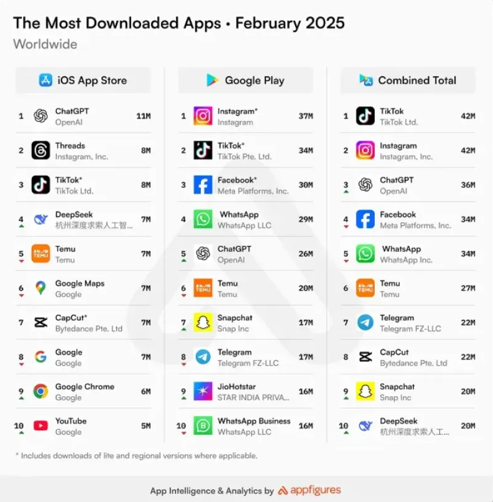 2月份在美国面临的禁令风波并没有打击到TikTok,恰恰相反的是,这家巨头继续保持强劲发展势头。据移动应用分析平台AppFigures发布的最新数据,2025年2月,TikTok全球下载量依然位居榜首,包括iOS和Google端总下载量达到4200万次,与第二名的Instagram基本持平。这也是TikTok继今年1月登顶后持续霸榜,实力可见一斑。