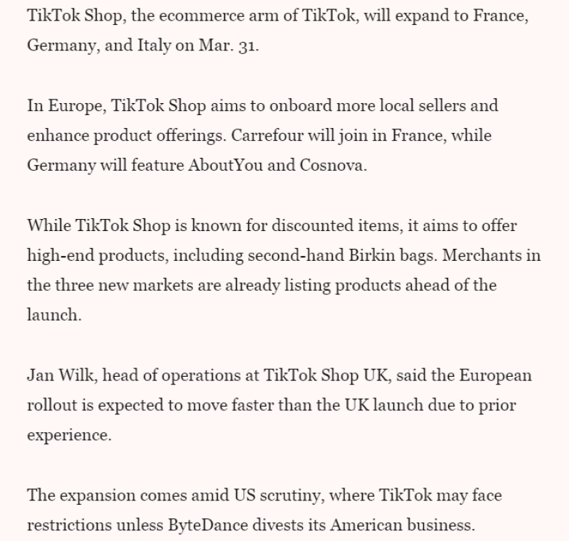 TikTok Shop于3月31日在法国、德国和意大利上线