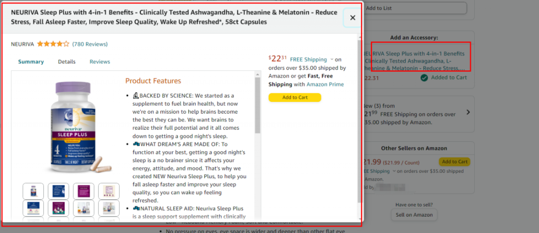 有卖家发现详情页右侧多了一个小版块,“Add an Accessory”,出现的产品是互补品,可以直接加入购物车,也可以点击进去选择变体加入购物车,非常方便,这样后期跟销量较高互补品强关联之后就可以得到更多的流量和订单呢?