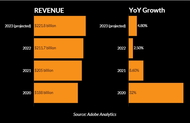 零售分析公司 Adobe 预测,2023 年美国在线假日支出将达到 2218 亿美元。这将使支出比 2022 年的2117 亿美元同比增长4.8%。