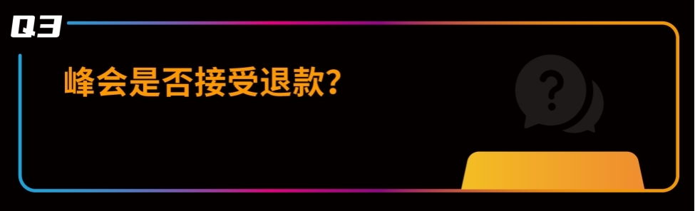 答:除因票种升级可能产生的已购低价票型门票退款外,峰会不接受其他形式的退款。请各位参会者合理预估参会需求并妥善安排行程。如遇特殊问题,请联系大会客服:2023CNSellerCon@freeman.com。