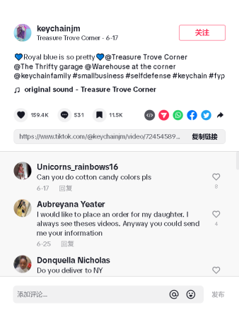 除去带货视频外,JackMacry还重视与用户的互动。DIY是JackMacry系列钥匙扣的宣传重点之一,在带货直播时,粉丝可以线上互动定制想要的款式,在日常发布的视频下留言定制意向也会被店铺官方留意到并且私信询问。通过直播和日常的互动,JackMacry在Tiktok上实现了目标受众的精准定位。