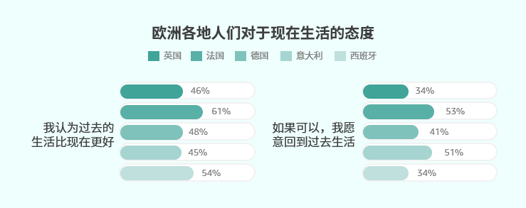 据益普索的调查研究表明,在对环境问题的忧虑以及其他因素的影响下,欧洲各地的人们更为认同过去的价值观,如传统、纪律和团结,以及对文化和历史的珍视。其中,德国、法国和意大利表现出更强的怀旧情节。