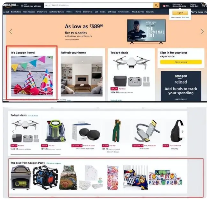 Coupon Party可以看作是日常优惠券活动的升级版本,Coupon Party活动期间,参加优惠券活动的商品曝光度将会大大增加。除了优惠券商品常规的商城前端显示外,亚马逊将在Amazon.com和Amazon.ca商城主页和优惠券页面上展示第三方卖家/供应商的设置了优惠券折扣的商品。