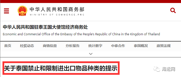 据驻泰王国大使馆经济商务处消息,近期,有部分中资企业反映,其通过泰国口岸进行转口贸易的商品因未按规定提前办理相关许可证而被扣留。为预防和减少商业损失,请广大中资企业开展贸易前通过泰国海关及其他相关部门网站了解相关规定。