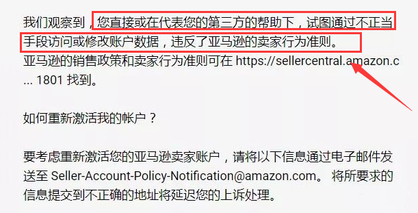 在亚马逊官方发来的通知中,告知卖家店铺被封,在要求卖家提交申诉材料中,被通知的原因是“利用第三方通过不正当手段访问或者修改账户数据”。