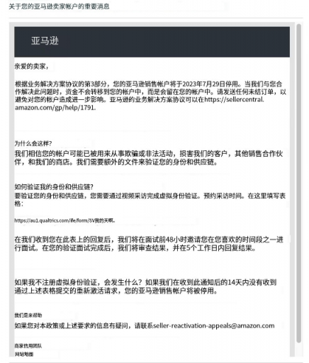 据卖家称,与此前视频验证不同的是,亚马逊在本次的通知邮件中明确指出:相关卖家账户可能被用于从事欺骗或非法活动,因此亚马逊需要额外的文件来验证该卖家的身份和供应链。