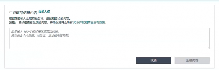 同时,这个新工具最多支持输入 100 个商品描述词。值得注意的是,不能包含姓名、地址或电话号码等个人数据。这一功能,能够帮助卖家一键撰写高质量Listing,节省卖家60%以上的的时间。