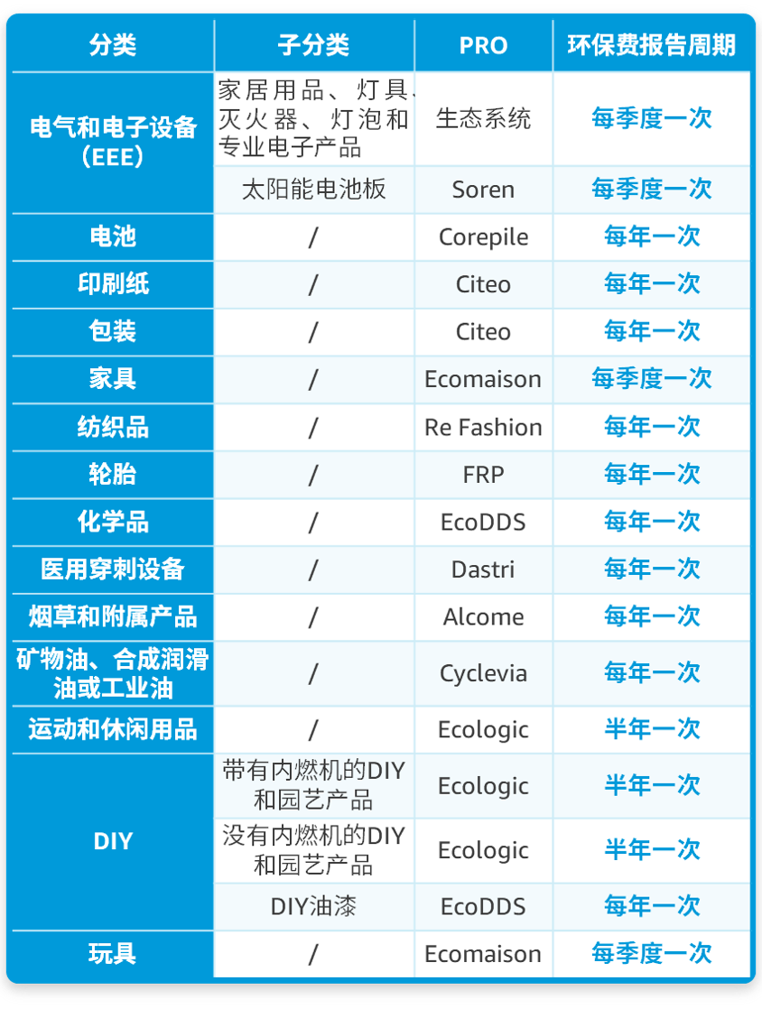 亚马逊已按照相关分类选择了特定的生产商责任组织(以下简称PRO)。PRO报告和付款周期因分类而异,包括每季度一次、半年一次和每年一次。下表详细介绍了为每个分类选择的PRO以及报告周期和付款频率。 请注意,环保费的收费周期与选定PRO的付款频率一致,但某些分类除外。例如,DIY产品这一分类下存在不同的报告周期。为了简化该流程,亚马逊每年向您收取DIY产品和其他类似分类的环保费。 *特别声明:建材分类会于2023年底前加入代付服务。