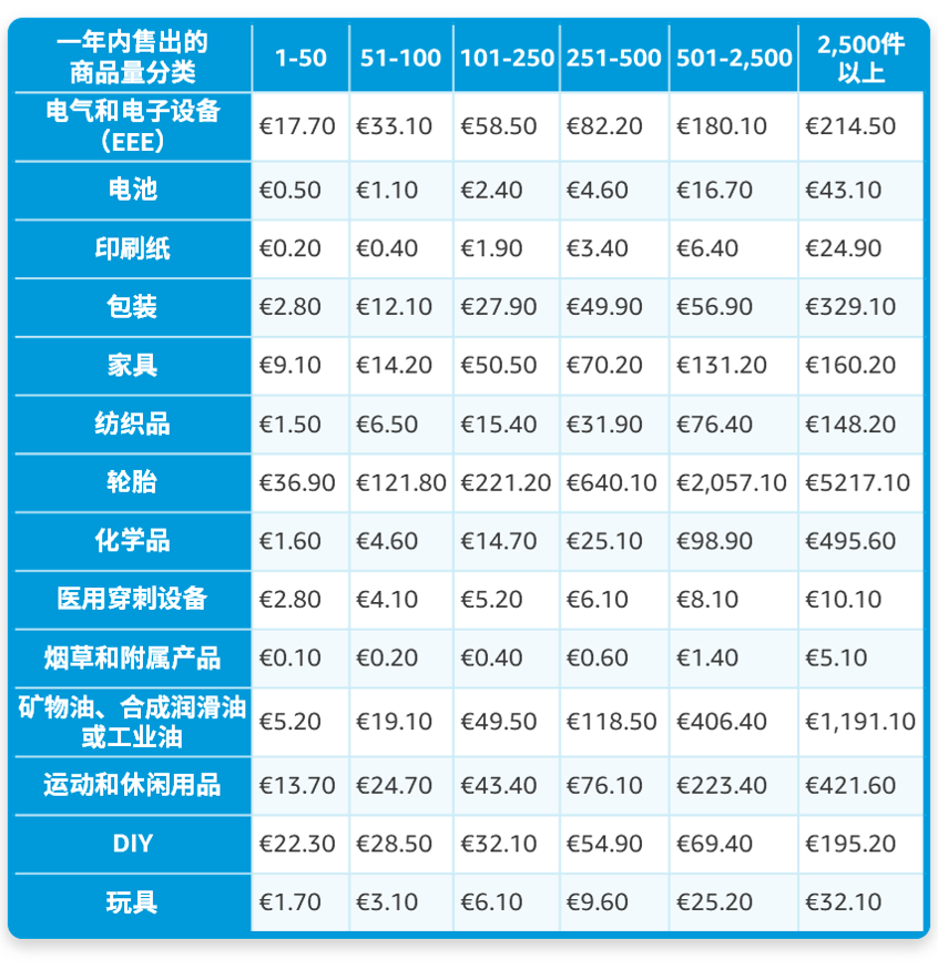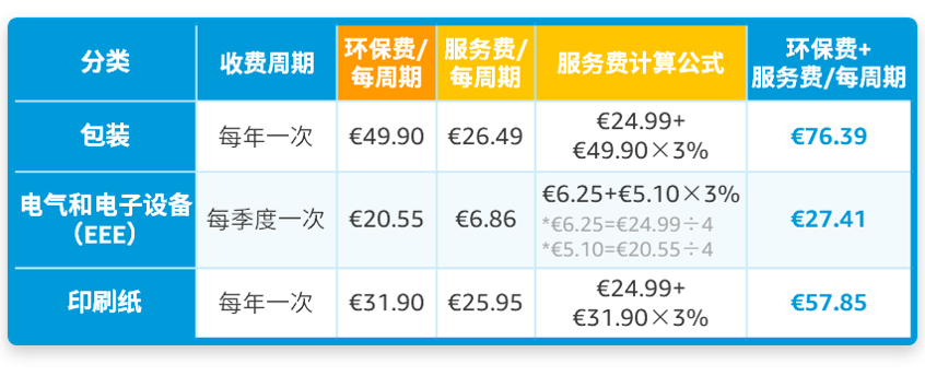 亚马逊就您在2023年及以后在亚马逊法国站(Amazon.fr)上的相关销售,向您提供EPR代付服务,并收取相应的服务费。 1年的法国EPR代付服务费=€24.99×使用代付服务的EPR分类数量+总代付环保费×3%。 *注:服务费的收费周期因分类而异。 亚马逊不对2022年销售收取服务费。如果2023年您在该分类下首次销售EPR适用商品,则不对2023年该分类的商品销售收取服务费。