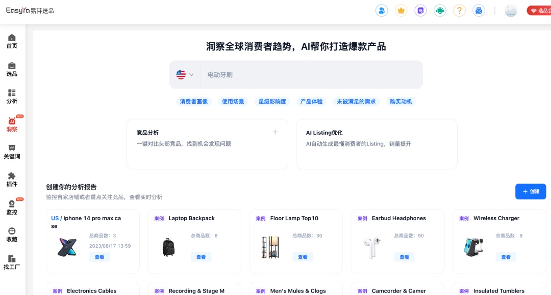 在易芽网页端AI洞察板块,用户可以根据核心关键词搜索相关商品,选择多款竞品创建商品集,一键获取全量评论分析报告,还可以进行竞品分析、AI Listing优化。在易芽插件端新增AI评论分析、Listing优化两大功能。