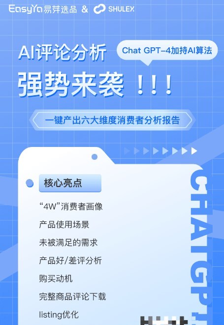 EasyYa易芽官网8月24日消息,EasyYa易芽与Shulex已联合推出全新的AI评论分析功能,该功能是基于ChatGPT-4的智能消费者声音洞察,帮助亚马逊卖家更深入了解消费者,提升产品质量和销量。