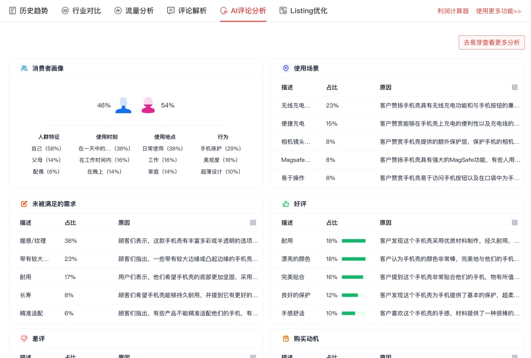 AI评论分析功能可以用于消费者画像分析、用户真实使用场景分析、星级影响度分析、产品体验分析、消费者真实购买动机分析和消费者未被满足的需求分析。