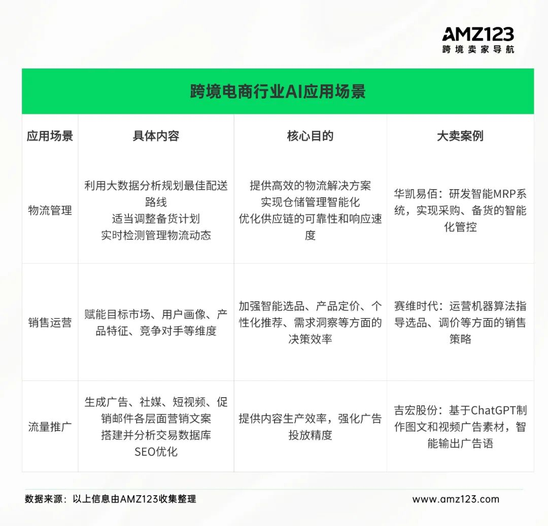 具体来看,AI在跨境电商行业的应用场景可以大致梳理为三个层次:物流管理、销售运营以及流量推广。