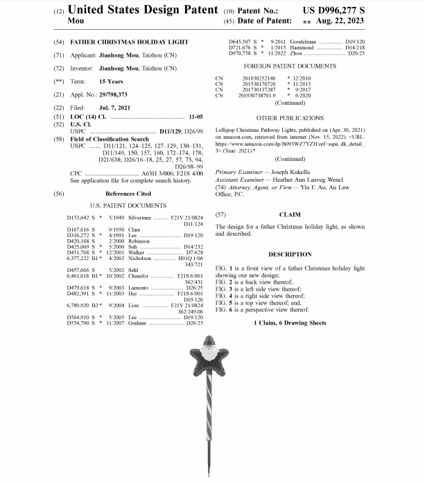 旺季备货,最怕侵权!轻则下架listing,重则销售权限被移除,分分钟错失爆单机会。经查询发现,很多圣诞热销品都有专利侵权风险,比如在8月22日就有一款圣诞地插灯专利下证: