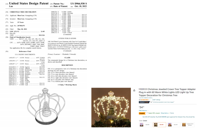 圣诞树是圣诞节的必需品,和圣诞树搭配使用的圣诞树装饰灯销量自然不会差。这类产品的专利侵权风险也不低,比如以下这款留评达2067的树顶皇冠装饰灯,2022年10月已获得授权,上架即有侵权风险:
