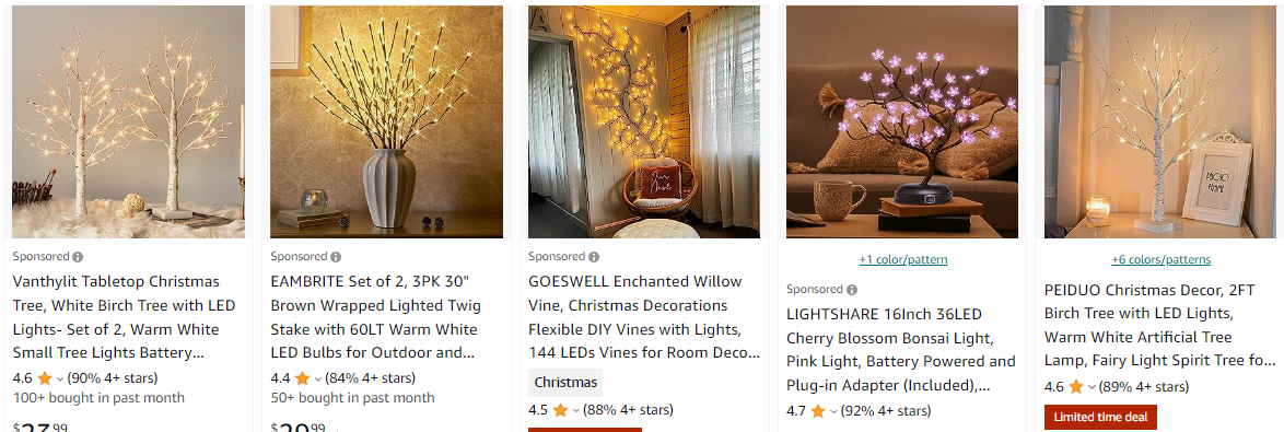 可放在桌面做装饰的树形灯集创意、美感与氛围感于一体,非常适合圣诞节。亚马逊上也有大量listing在售,各类款式都收到不少好评。