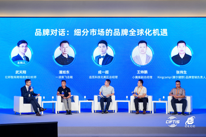 跨境头条9月6日讯,在2023中国电子商务大会上,一凌宸飞总裁潘旭东、追觅科技北美区总经理成一超、小魔兽副总经理王帅鹏、KingCamp(康尔健野)营销副总裁张伟生以及亿邦智库跨境首席分析师武天翔围绕“细分市场的品牌全球化机遇”这一主题进行了圆桌对话。