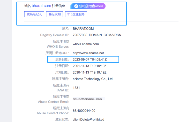 其二,品牌相关版权要尽快注册,包括品牌名、品牌域名等内容。如果印度真的将英文名改为“bharat”,不知其是否需要以“bharat”命名的域名。已知的是,“bharat.com”已经被某机构注册,甚至连夜进行了更新,不知是否是看到新闻起来续费延长域名到期时间。