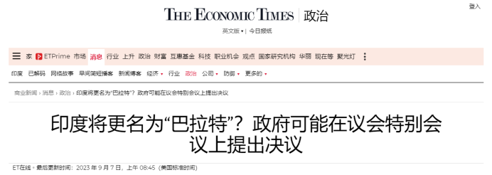 据了解,印度官方语为印地语和英语,英语称印度为India,印地语为Bharat(巴拉特,也即婆罗多)。现今,印度多家媒体报道,印度政府可能会在9月18日至22日举行的议会特别会议上,正式提出将印度的英文名India更改为Bharat的提议。