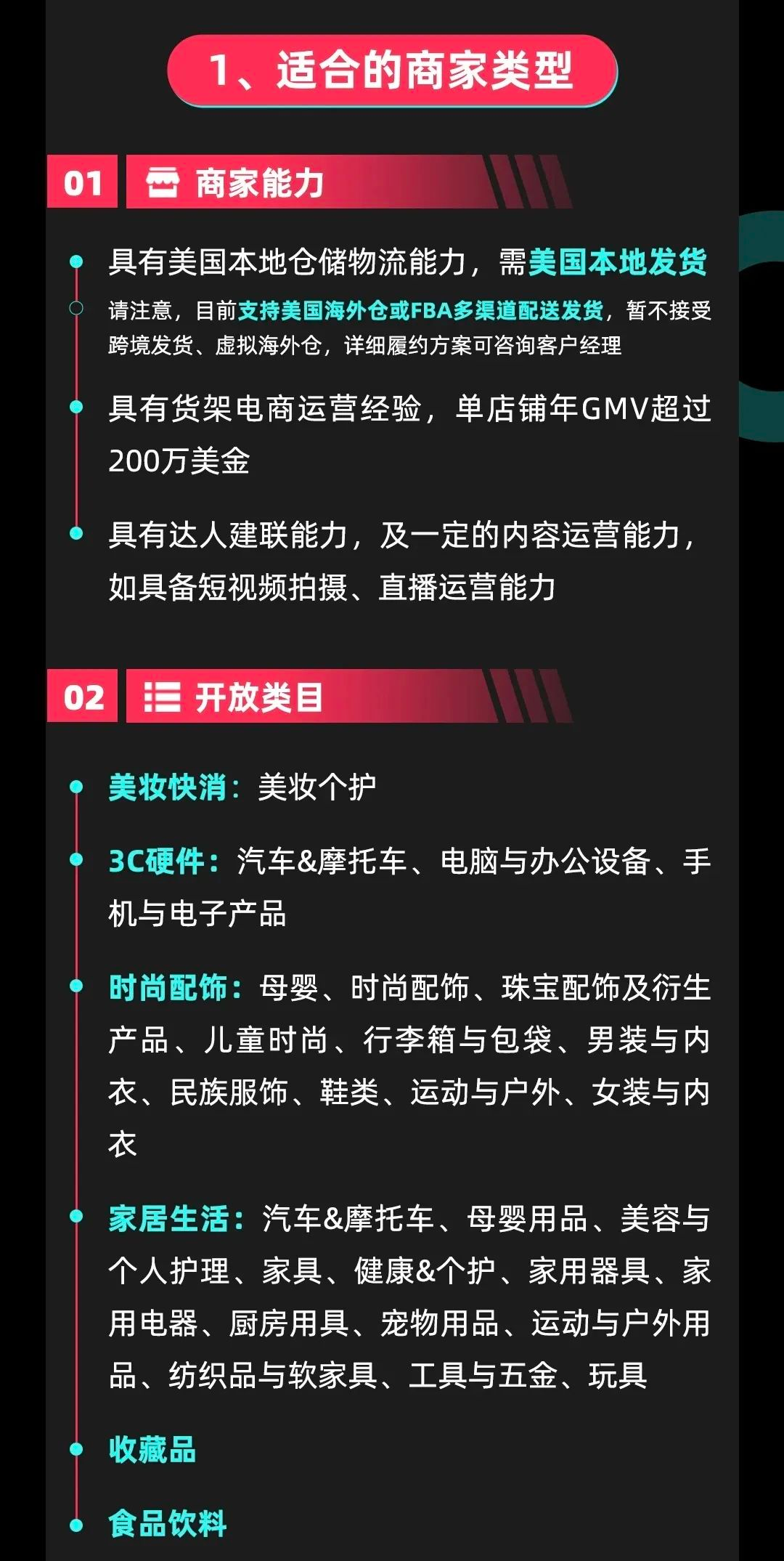 其中," 美国本土发货商家 "适合具备较强的美国本地仓储物流能力与货架电商运营经验和一定内容能力,在其他跨境头部平台单店铺年 GMV 超过 200 万美金的卖家。