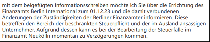 2023年12月4日起,柏林国际税局 (Finanzamt Berlin International) 正式成立。