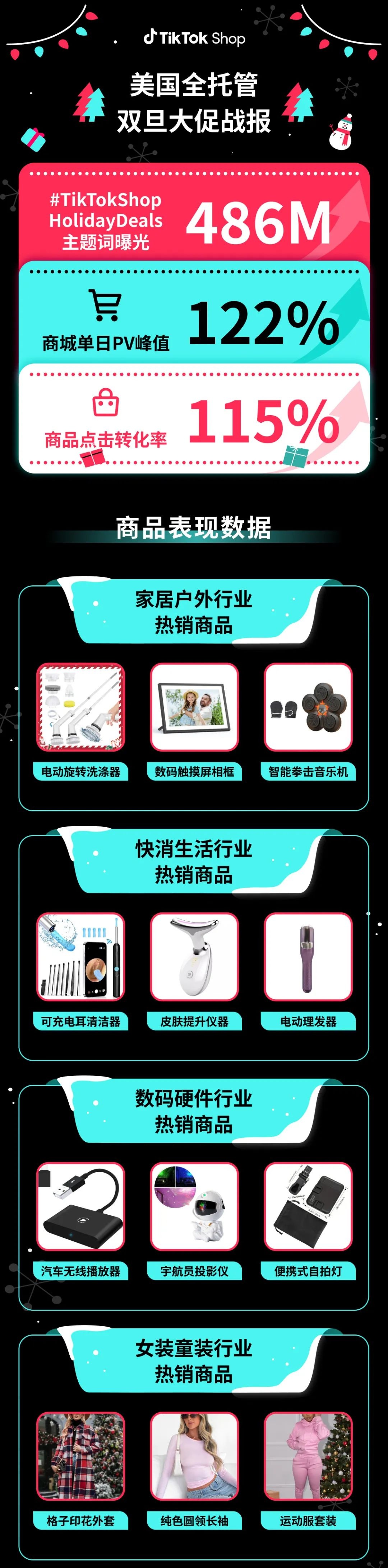 近日,TikTok Shop公布全托管美国双旦大促战报。数据显示,双旦大促期间,#TikTokShopHolidayDeals主题词曝光流量达486M;商城单日PV峰值达122%;商品点击转化率达115%。