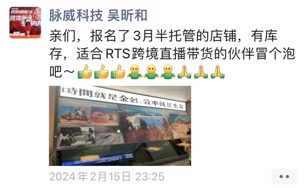 “我们不仅自己报名了半托管,还打算抓住半托管跨境直播的风口。”擅长跨境直播带货的深圳市脉威时代科技有限公司营销总监吴昕和,春节期间就在朋友圈发布了“代播”的的预告,她说半托管商品都是现货可发,物流时效有保障,对跨境直播更友好,他们已经和中山当地一家职业学院联合,为半托管跨境直播储备了60人的英语、外贸专业人才团队。